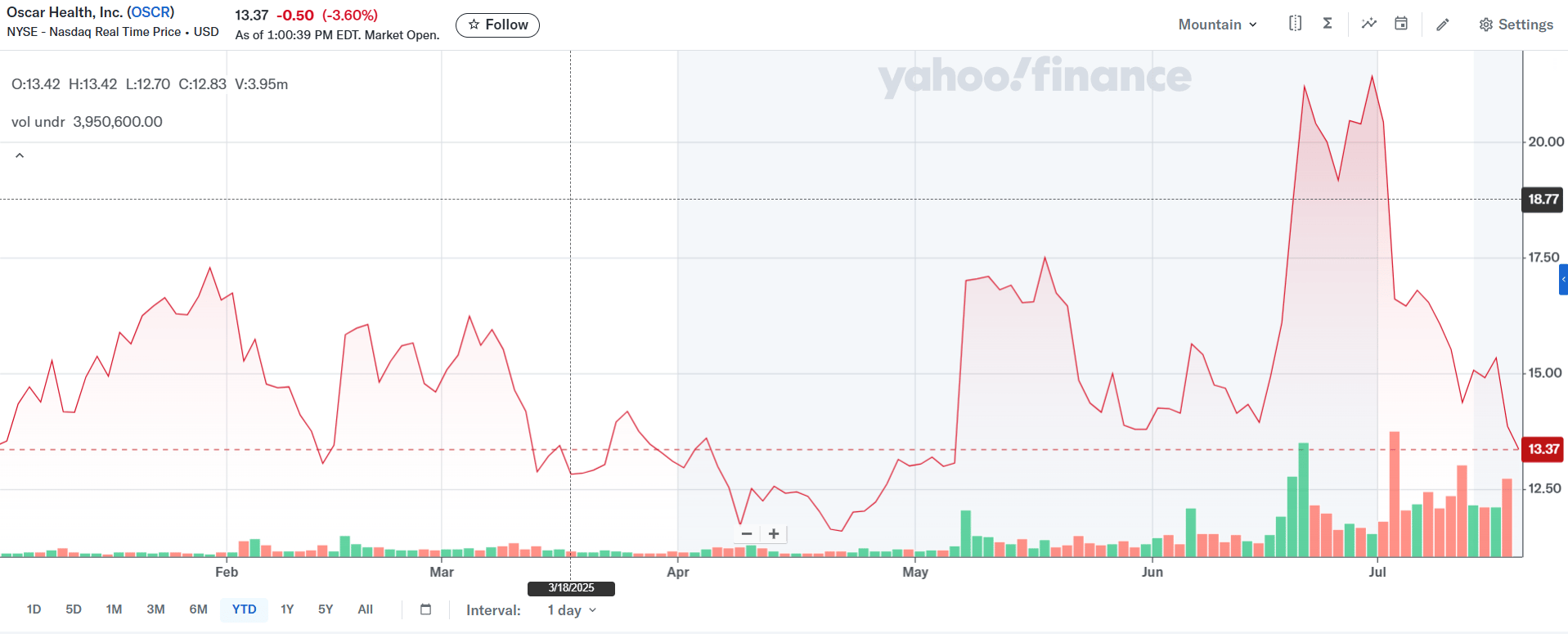 OSCR's stock has been a rollercoaster, reflecting the healthcare sector's sensitivity to regulations and economic shifts. As of July 16, 2025, shares closed at $15.35, up 2.88% for the day and 14.21% year-to-date—outpacing the S&P 500's 6.50% gain. However, it's down 5.19% over the past year, trading within a 52-week range of $11.20 to $23.79.